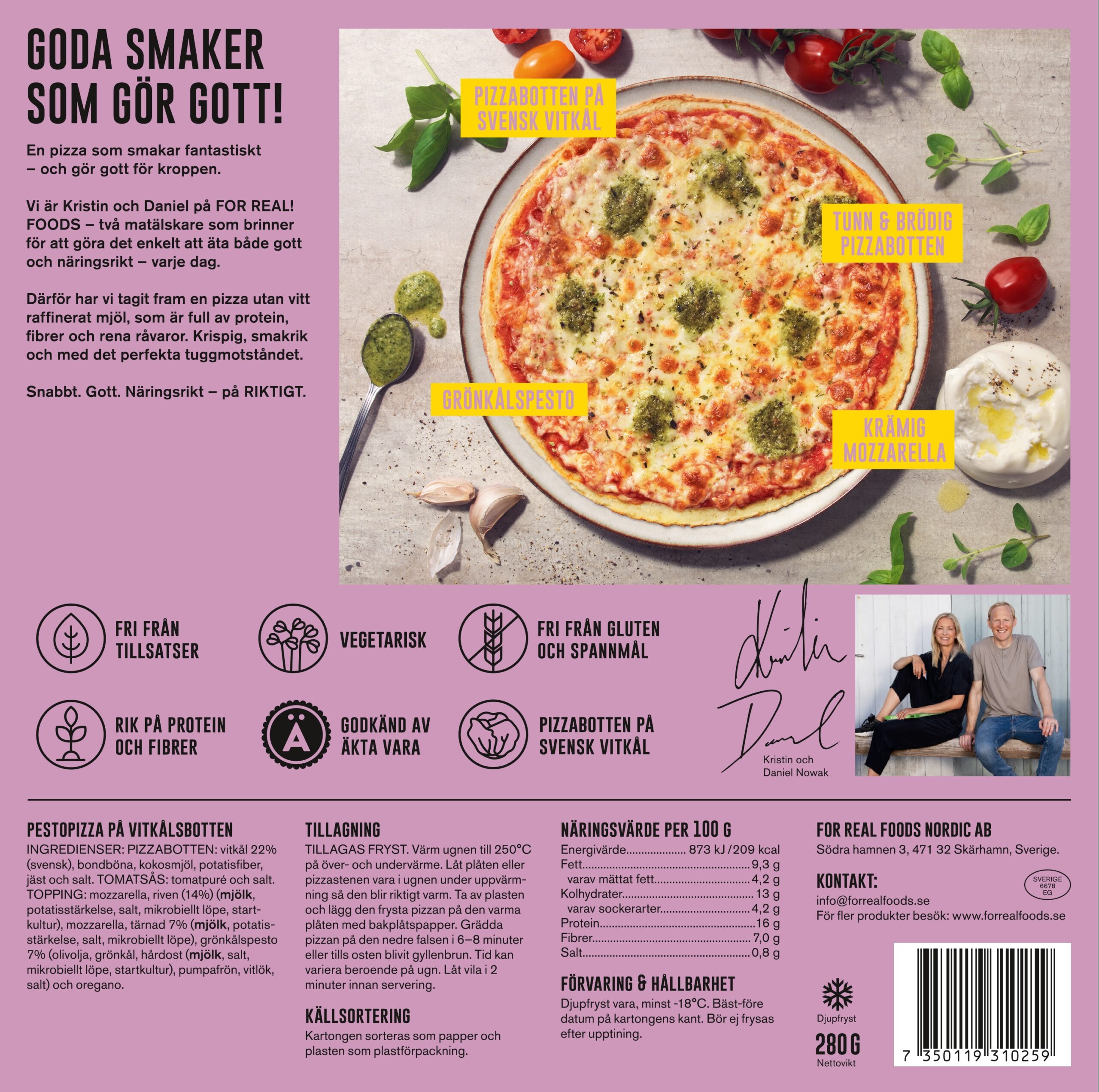 Bread-free pizza that is baked on Swedish locally grown white cabbage crust completely without grain and with 100% natural ingredients. Enjoy a tasty product that leaves you with a nice and fresh feeling of satiety. Perfect for those who like Low Carb, Keto, Gluten-free or for those who just want to eat nutritious and real food without additives. Produced in Skärhamn on Tjörn.