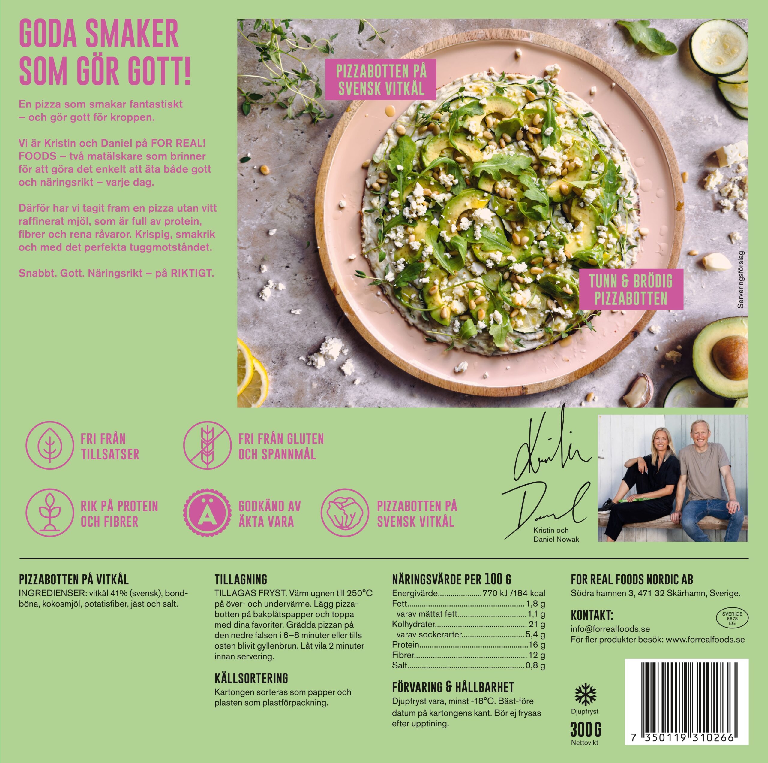 Leivättömän kasvipohjaisen pizzapohjan, joka on leivottu ruotsalaisella, paikallisesti kasvatetulla valkokaalilla täysin ilman viljaa ja 100 % luonnollisista ainesosista. Nauti pizzasta, joka jättää mukavan ja raikkaan kylläisyyden tunteen. Täydellinen niille, jotka pitävät Low Carbista, ketoosista, gluteenittomuudesta tai niille, jotka haluavat vain syödä ravitsevaa ja aitoa ruokaa ilman lisäaineita. Tuotettu Skärhamnissa Tjörnillä.
